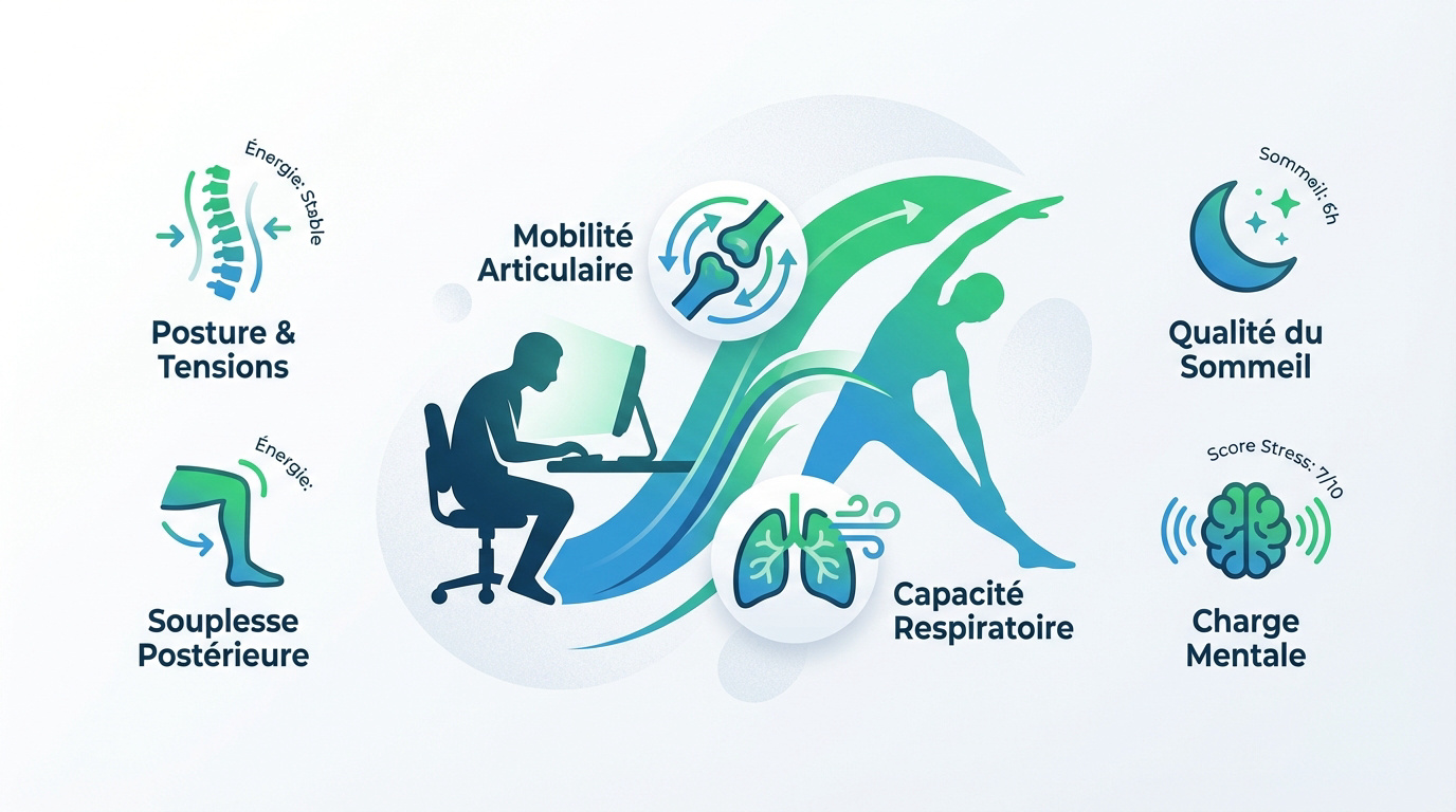 Pour un profil sédentaire, l'accent est mis sur l'amplitude articulaire, souvent réduite par la position assise prolongée. On utilise des tests simples comme la flexion du tronc (distance doigts-sol) ou l'observation de la mobilité des épaules, des hanches et des chevilles.