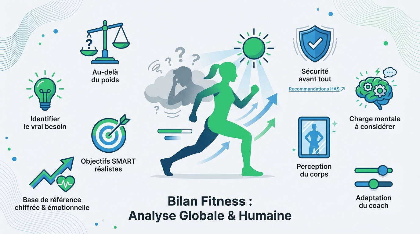 Le bilan fitness moderne intègre une évaluation de la charge mentale et de la qualité de récupération. On utilise des questionnaires d'auto-évaluation pour quantifier votre niveau de fatigue, votre irritabilité et la qualité de votre sommeil effectif.