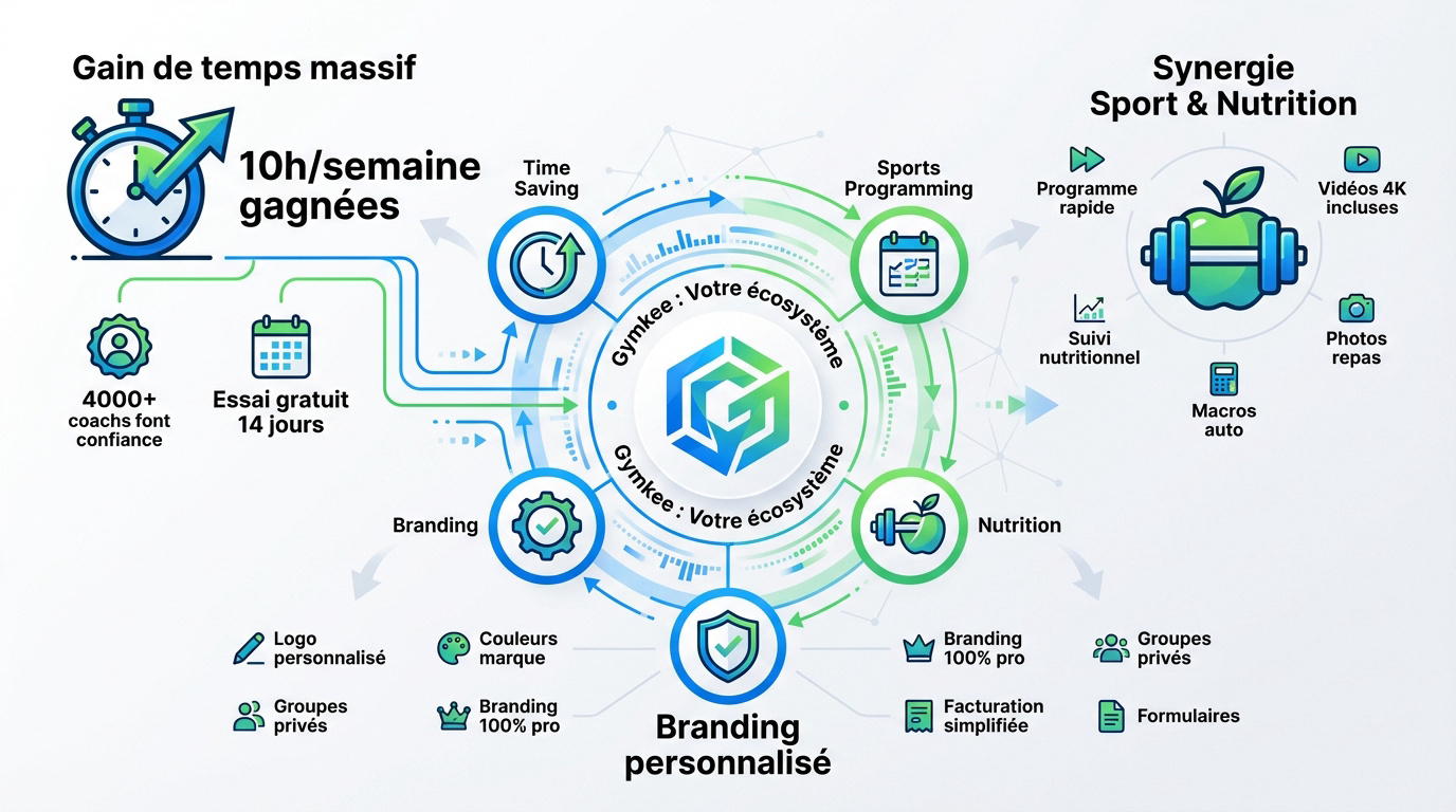 L'essentiel à retenir : Gymkee s'impose comme l'écosystème le plus rapide pour centraliser entraînements et nutrition en un seul lieu. Cette solution libère votre emploi du temps en automatisant la gestion administrative et la vente de programmes. Le bénéfice est immédiat : vous économisez jusqu'à 10 heures par semaine. Déjà 4 000 coachs valident cette efficacité redoutable. Découvrez Gymkee gratuitement