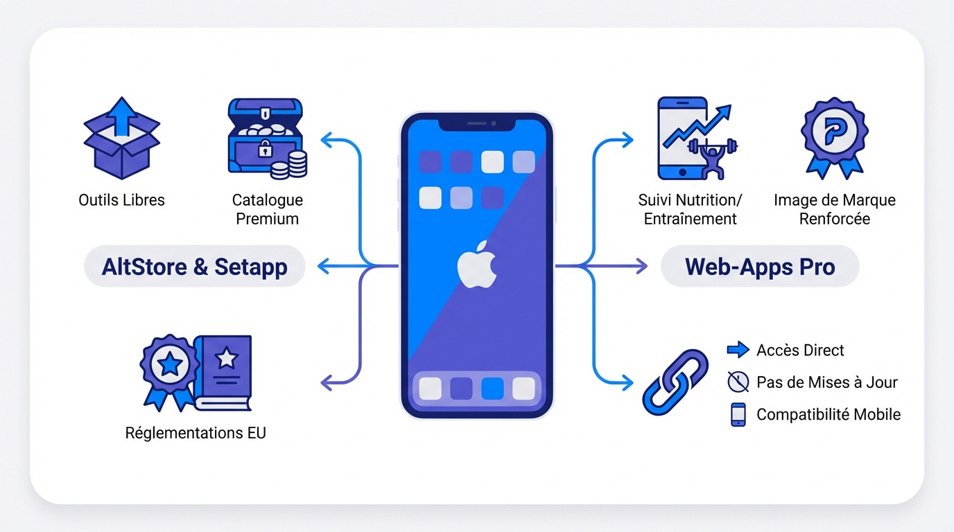 Absolument ! Bien que l'App Store reste la référence, des alternatives comme AltStore ou Setapp permettent d'accéder à des catalogues différents. AltStore est prisé pour le "sideloading" d'outils spécifiques, tandis que Setapp propose un système d'abonnement premium pour des applications rigoureusement sélectionnées. Pour des besoins professionnels comme le coaching sportif, les web-apps représentent aussi une option stratégique. Elles s'utilisent directement via un navigateur sans aucun téléchargement, offrant une flexibilité totale et une personnalisation aux couleurs de votre marque.