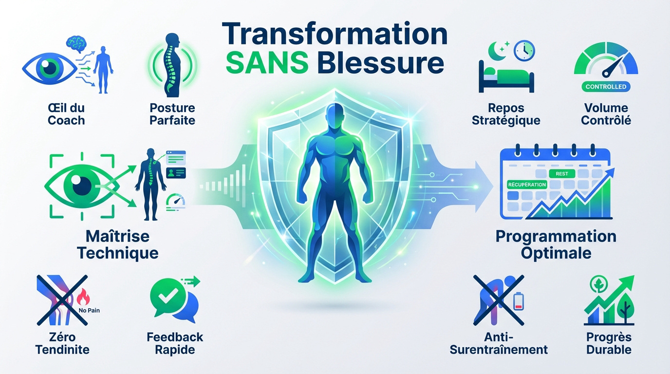 Absolument ! L'œil expert de votre coach est votre meilleur bouclier physique. Il corrige instantanément votre posture et votre technique pour protéger vos articulations et votre dos. De plus, il gère scientifiquement votre volume de travail pour bannir le surentraînement. Vous progressez en toute sécurité, avec la certitude que chaque mouvement est exécuté à la perfection pour votre santé.