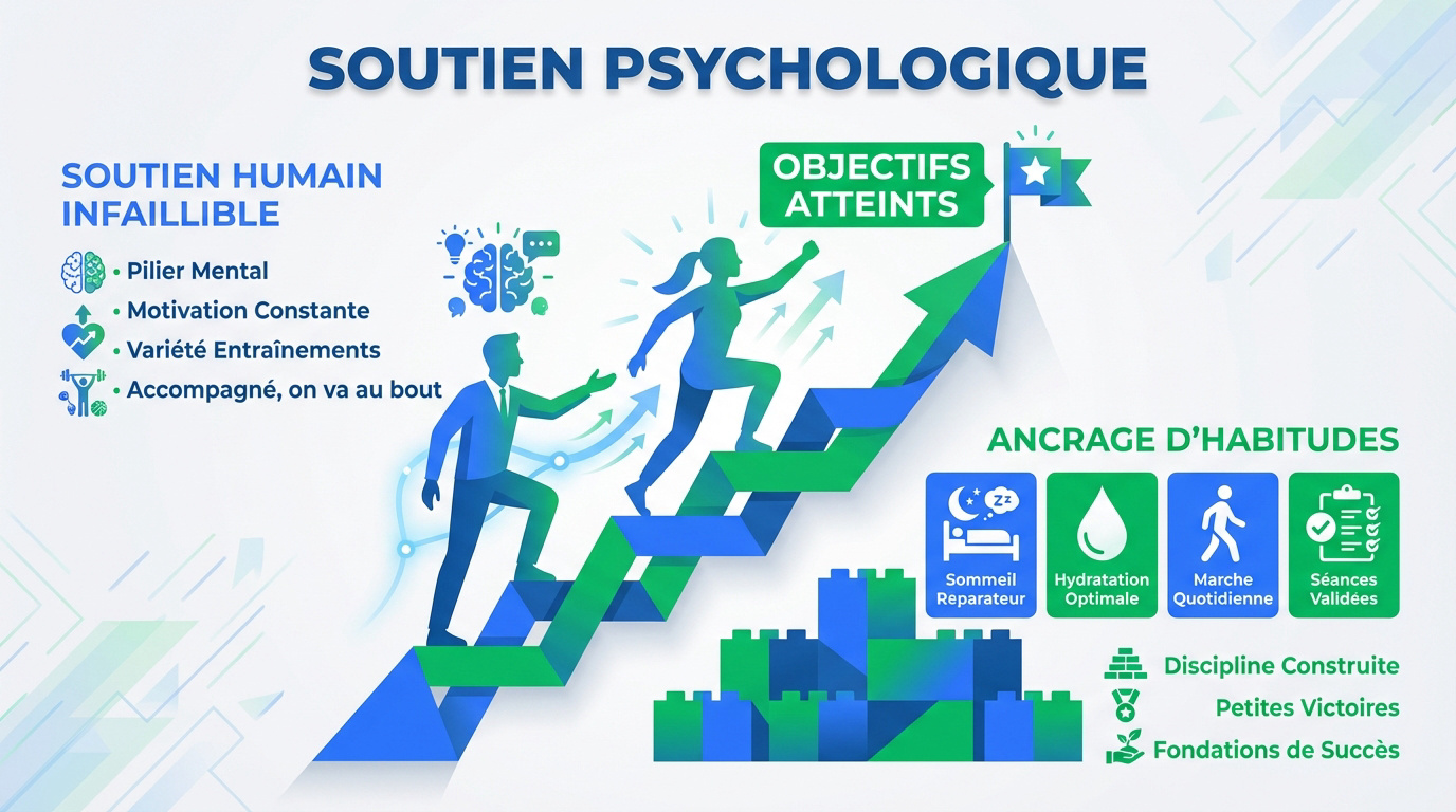 Oubliez les robots. Votre coach est un pilier mental massif quand le doute s'installe. Il décrypte vos signaux de fatigue pour relancer la machine avec les mots justes. Ce soutien transforme chaque baisse de régime en une simple étape nécessaire.
