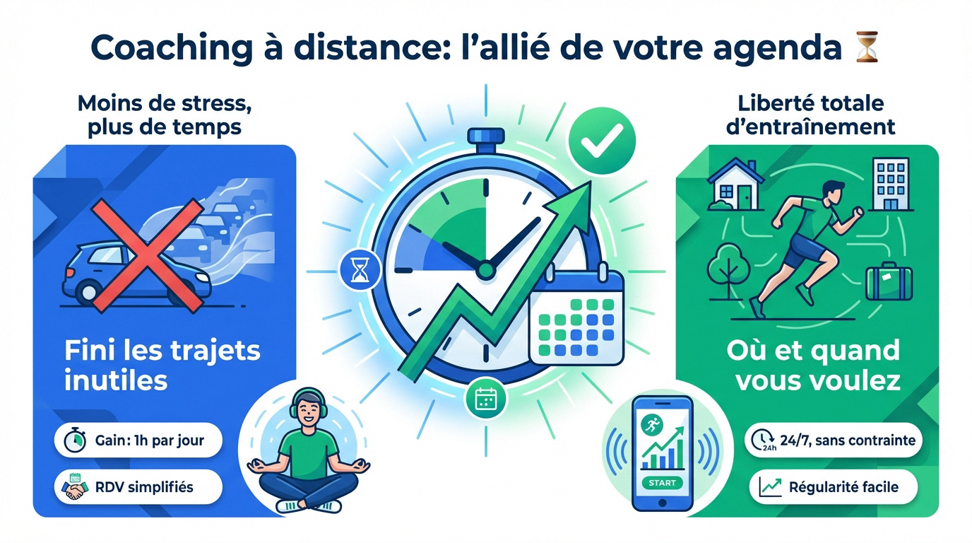 Le coaching à distance est le meilleur allié de votre agenda. Il élimine totalement les contraintes géographiques et les temps de trajet chronophages, vous faisant gagner en moyenne une heure par jour. Vous profitez d'une liberté totale pour vous entraîner où vous le souhaitez : à domicile, au bureau ou même en déplacement professionnel.