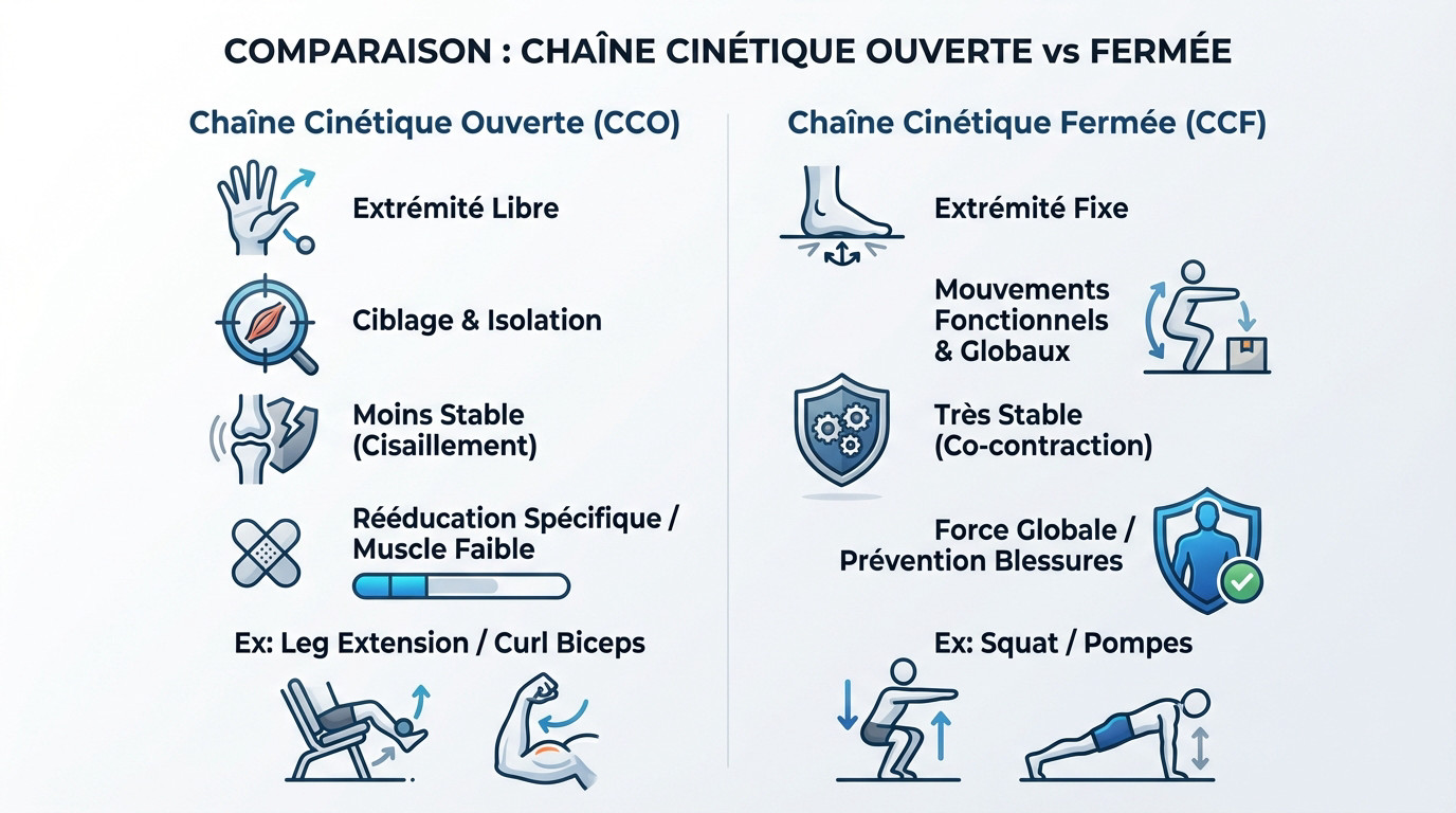 | Critère | Chaîne Cinétique Ouverte (CCO) | Chaîne Cinétique Fermée (CCF) |