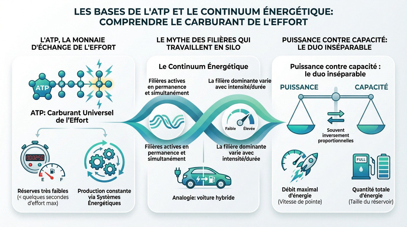 L'essentiel à retenir : l'énergie musculaire provient de trois filières (aérobie, anaérobie lactique et alactique) agissant en synergie constante, et non isolément. Cette compréhension du continuum énergétique permet d'adapter précisément l'intensité des entraînements. Notez que le système alactique, bien que le plus puissant, s'épuise en moins de 10 secondes, une donnée cruciale pour optimiser vos performances.