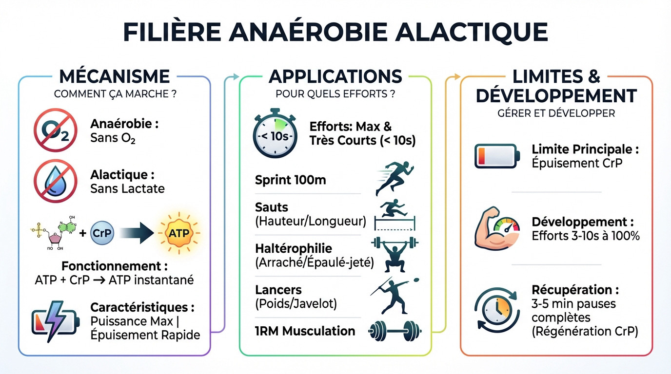 Cette filière est la reine incontestée des efforts maximaux et très courts. On parle ici d'actions fulgurantes de moins de 10 secondes. C'est l'essence même de la force pure et de la vitesse.