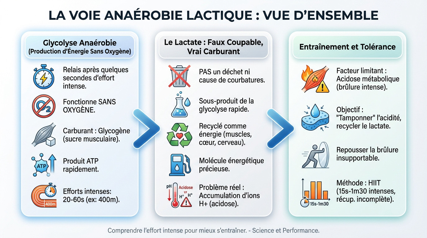 Imaginez que votre moteur change brutalement de vitesse : cette filière énergétique s'active après quelques secondes d'effort maximal. Elle prend le relais quand le premier réservoir est vide. Elle fonctionne, elle aussi, totalement sans oxygène.
