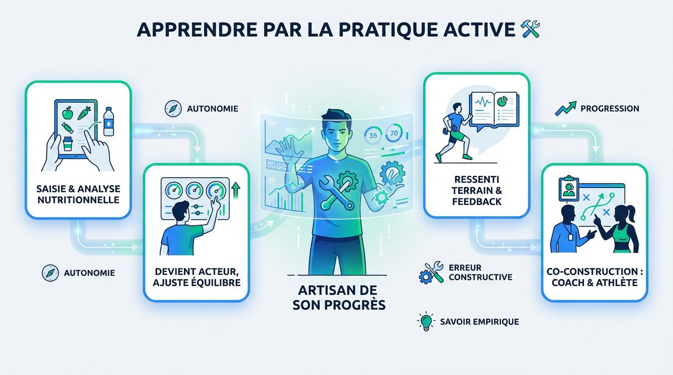 L'approche constructiviste mise sur l'apprentissage par la pratique où l'élève devient l'artisan de son propre savoir. En utilisant des outils comme le journal de bord ou l'auto-analyse nutritionnelle, l'athlète ne se contente plus de suivre un plan : il construit son équilibre en comprenant les interactions entre ses actions et ses résultats physiques réels. Dans ce modèle, l'erreur est perçue comme une leçon constructive. Ajuster un repas après un écart ou modifier un exercice selon son ressenti terrain permet une co-construction dynamique entre le coach et l'élève. C'est cette appropriation directe des données qui garantit une autonomie et une progression durable.