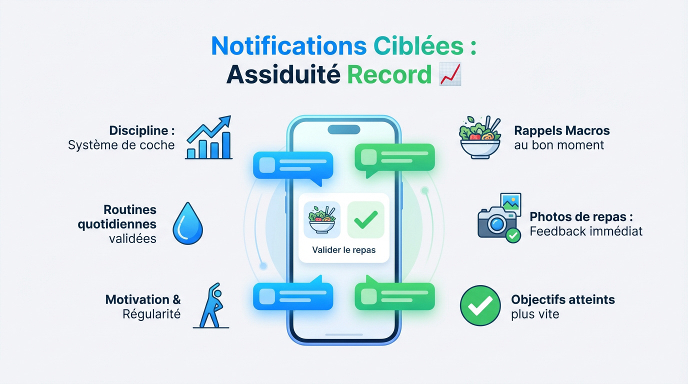 Le push agit comme un déclencheur psychologique puissant pour ancrer de nouvelles habitudes. En envoyant un rappel au bon moment — pour valider un repas ou une séance — vous réduisez l'oubli et boostez la motivation. Vos élèves ne sont plus jamais seuls ; ils se sentent soutenus et guidés en permanence, ce qui garantit des résultats physiques concrets.