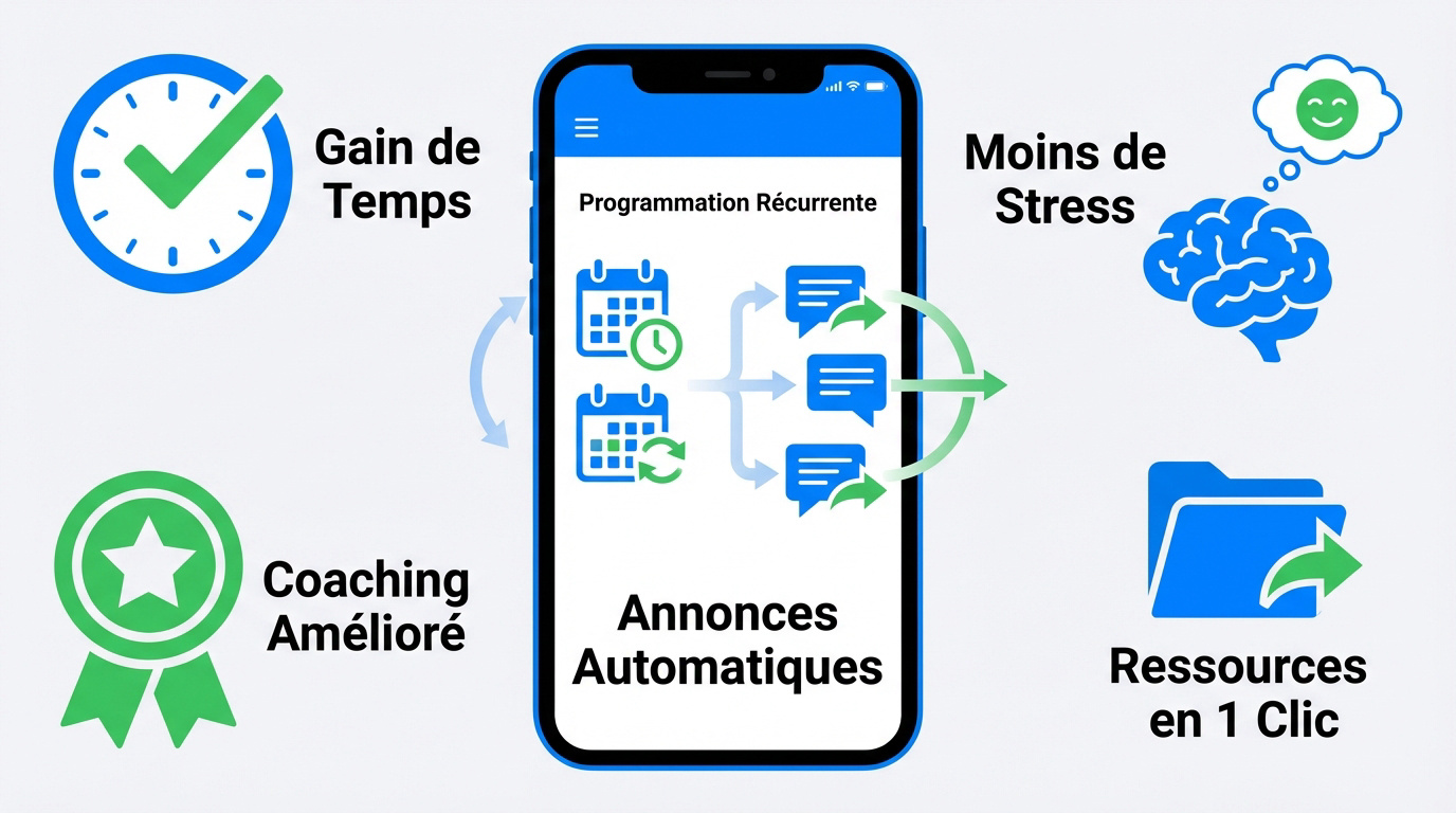 Absolument. Vous pouvez planifier vos annonces pour tout le mois en quelques clics. Qu'il s'agisse de conseils nutritionnels récurrents ou de rappels pour vos lives, l'application gère la logistique à votre place. Cela réduit drastiquement votre charge mentale et vous permet de vous concentrer sur l'essentiel : la performance de vos athlètes.