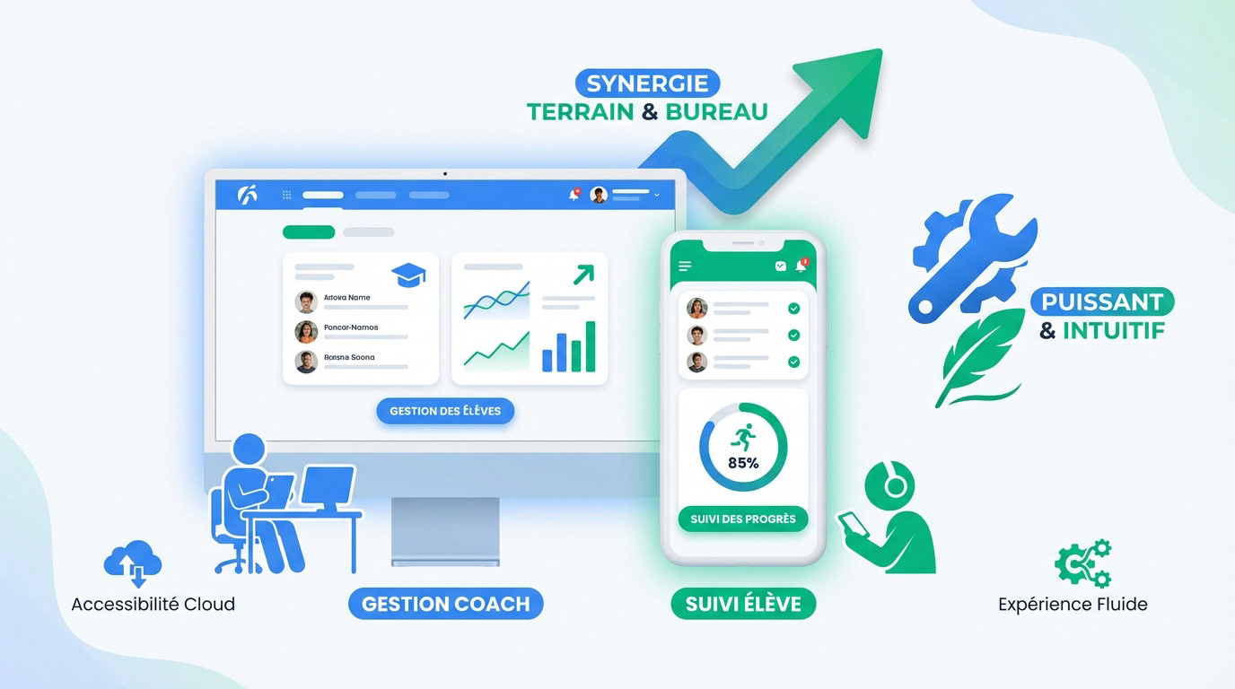 FitLab propose une double interface optimisée. Le coach gère sur son ordinateur tandis que l'élève suit sur son téléphone. C'est une synergie parfaite pour le terrain et le bureau.
