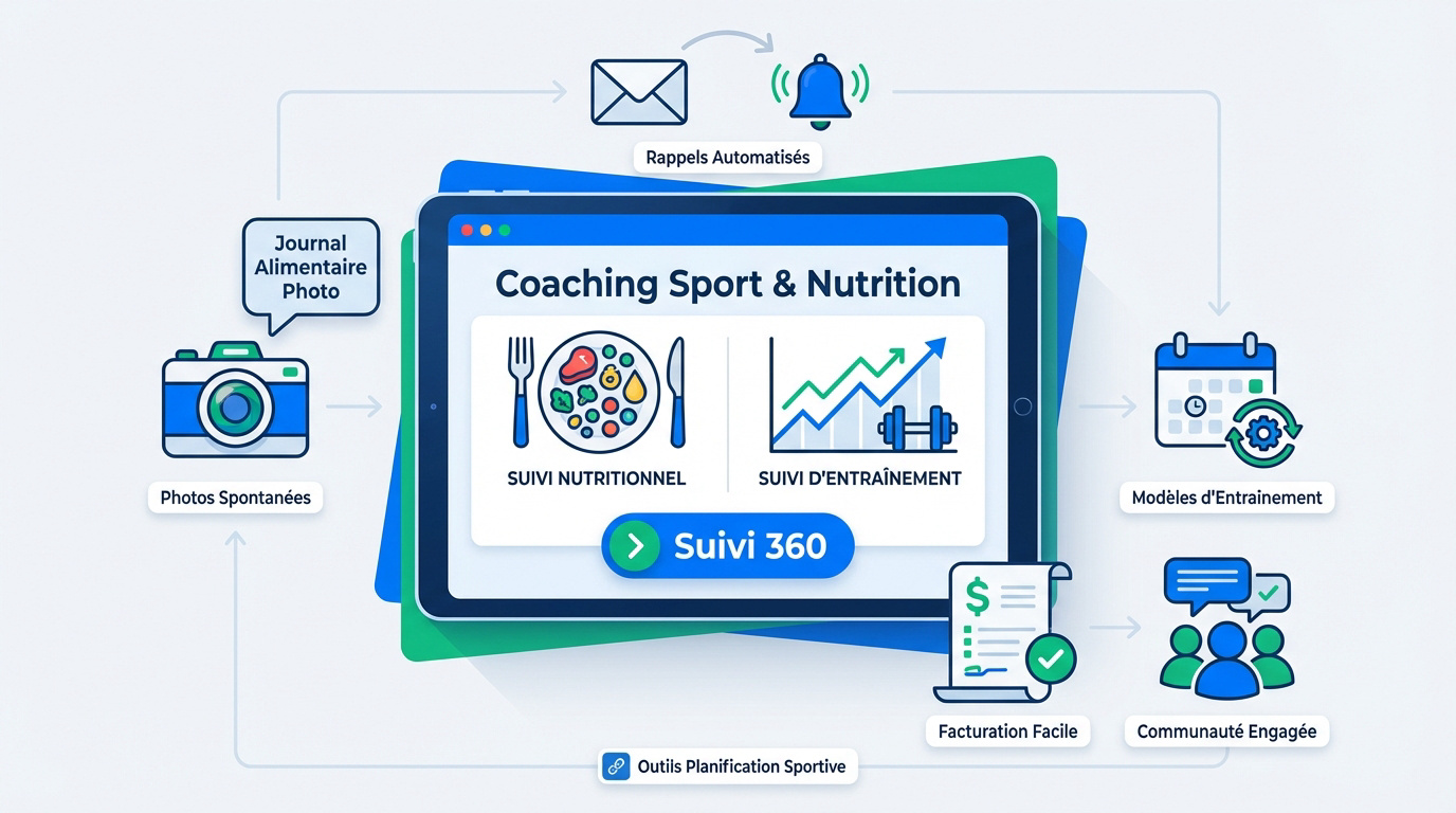 Infographie récapitulative des fonctionnalités de suivi sportif et nutritionnel pour coachs
