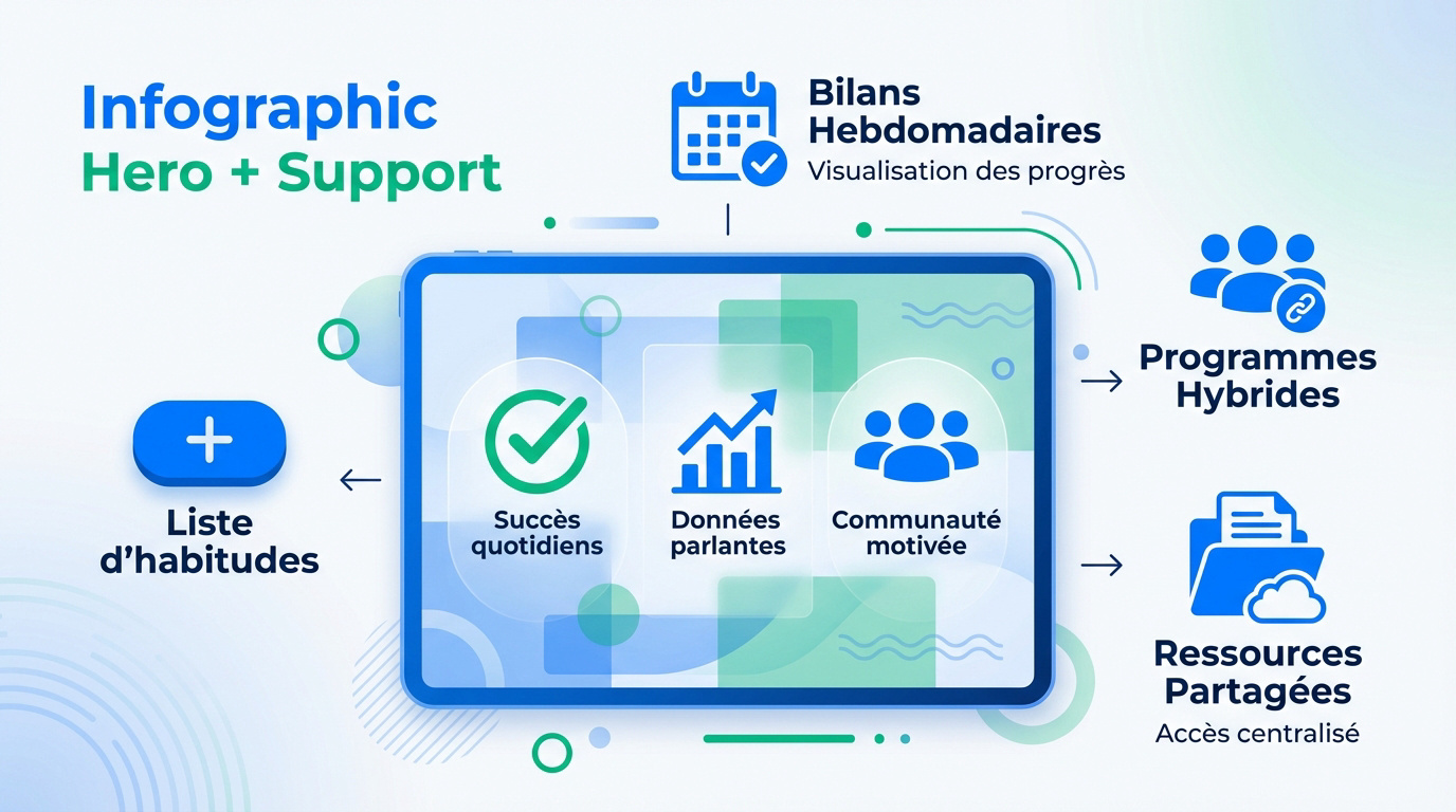 Interface de suivi des habitudes et tableau de bord de progression pour coach sportif