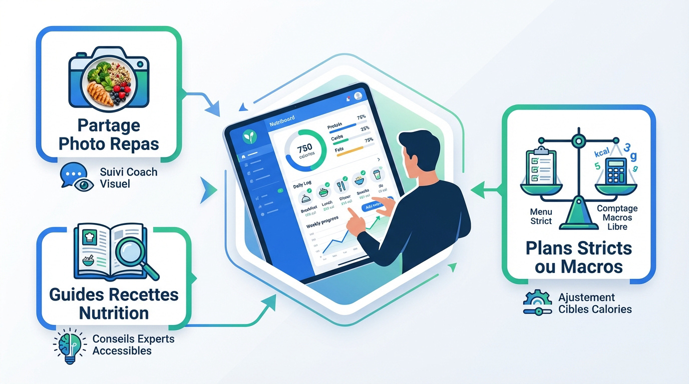 Oui, grâce à une flexibilité totale. Vous pouvez alterner entre des plans alimentaires stricts et le simple comptage de vos macros lors de vos sorties sociales. Le partage de repas en photo permet un suivi visuel honnête et des retours constructifs de votre coach, simplifiant ainsi la gestion de votre assiette au quotidien. 🥗