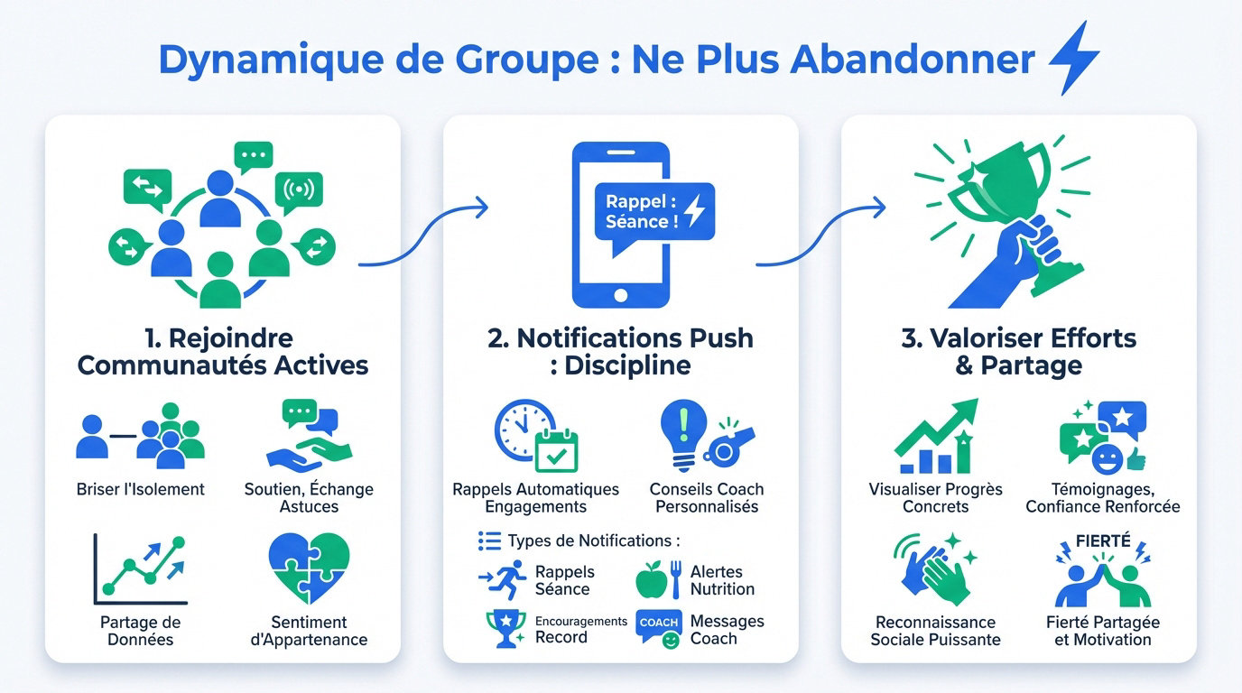 Absolument ! L'intégration de la gamification (défis, badges, classements) augmente l'engagement des utilisateurs de près de 48 %. Rejoindre une communauté en ligne permet de briser l'isolement et de transformer l'effort en une expérience interactive. Le sentiment d'appartenance à un groupe virtuel devient un moteur puissant pour ne jamais abandonner. ⚡