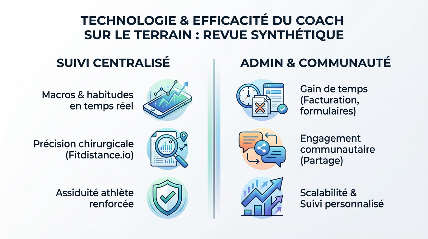 Centralisez vos données pour gagner en efficacité. Des applications comme Slek vous permettent de planifier les séances et d'analyser la progression de vos athlètes directement depuis votre mobile. Tout est synchronisé et accessible instantanément. Couplez cela aux objets connectés (montres Garmin, Apple Watch) pour récupérer automatiquement les données d'entraînement. Vous passez ainsi d'un suivi approximatif à un pilotage précis basé sur des chiffres concrets.