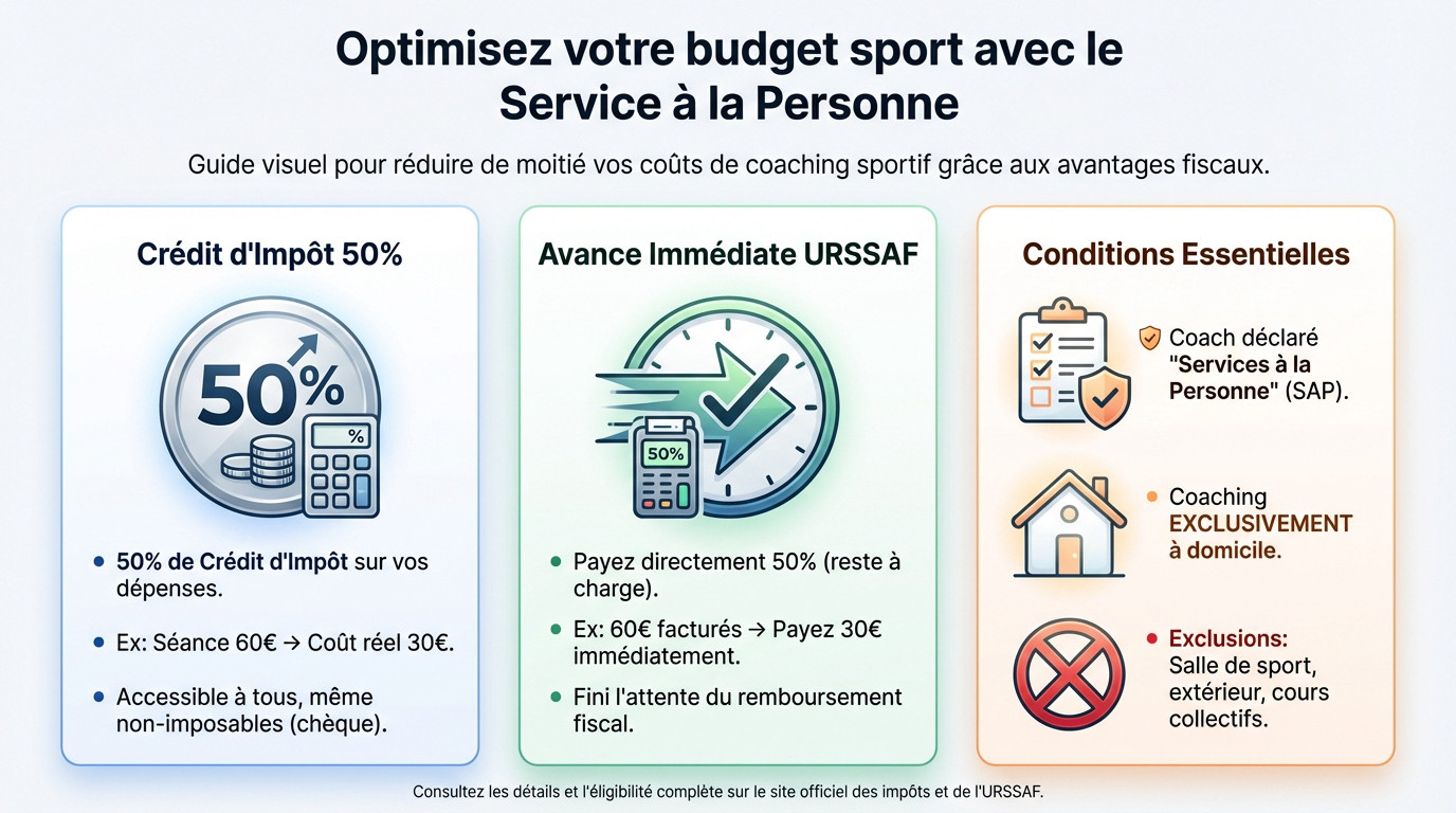 Le prix coach sportif vous semble élevé ? Le principe du crédit d'impôt de 50% pour les services à la personne transforme l'équation. Pour une séance facturée 60€, le coût réel après avantage fiscal n'est que de 30€. C'est une réduction directe.
