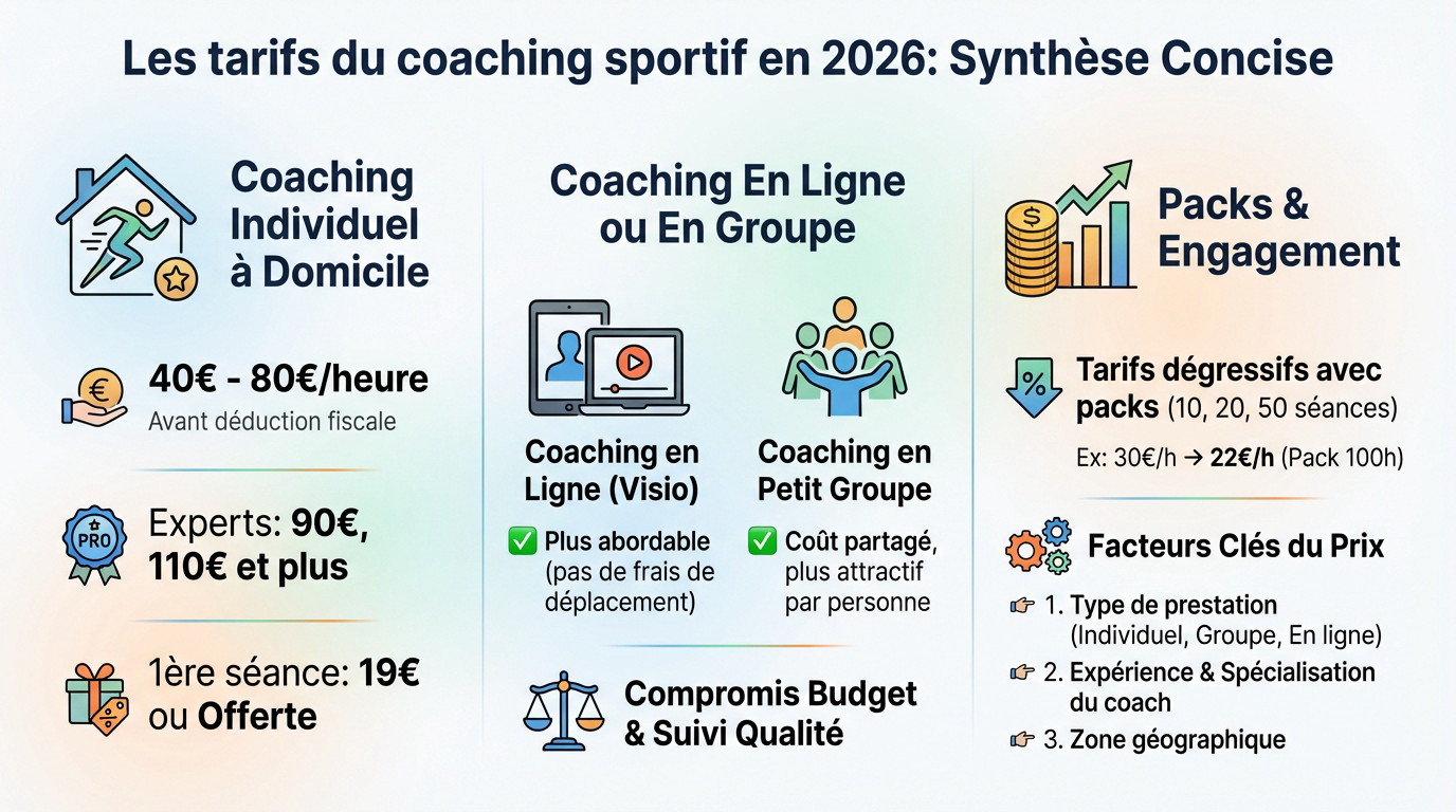 Le tarif d'un coach sportif varie considérablement selon son expérience, sa localisation et le format choisi. En moyenne, comptez entre 40€ et 80€ de l'heure pour un cours individuel avant toute déduction fiscale. Des experts très demandés ou spécialisés (réathlétisation, préparation physique spécifique) peuvent facturer jusqu'à 110€, voire plus. À l'inverse, des coachs débutants ou des séances en visio peuvent se situer autour de 30€ à 40€.