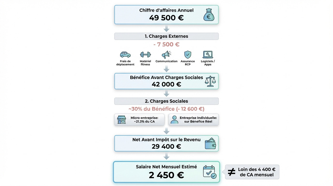 Imaginez un coach avec un CA annuel de 49 500 € et 7 500 € de charges externes. Son bénéfice est de 42 000 €. En appliquant un taux de charges sociales d'environ 30% sur ce bénéfice, il lui reste 29 400 € net avant impôt sur le revenu. Cela ramène son salaire à environ 2 450 € net par mois. On est loin des 4 400€ de CA mensuel.