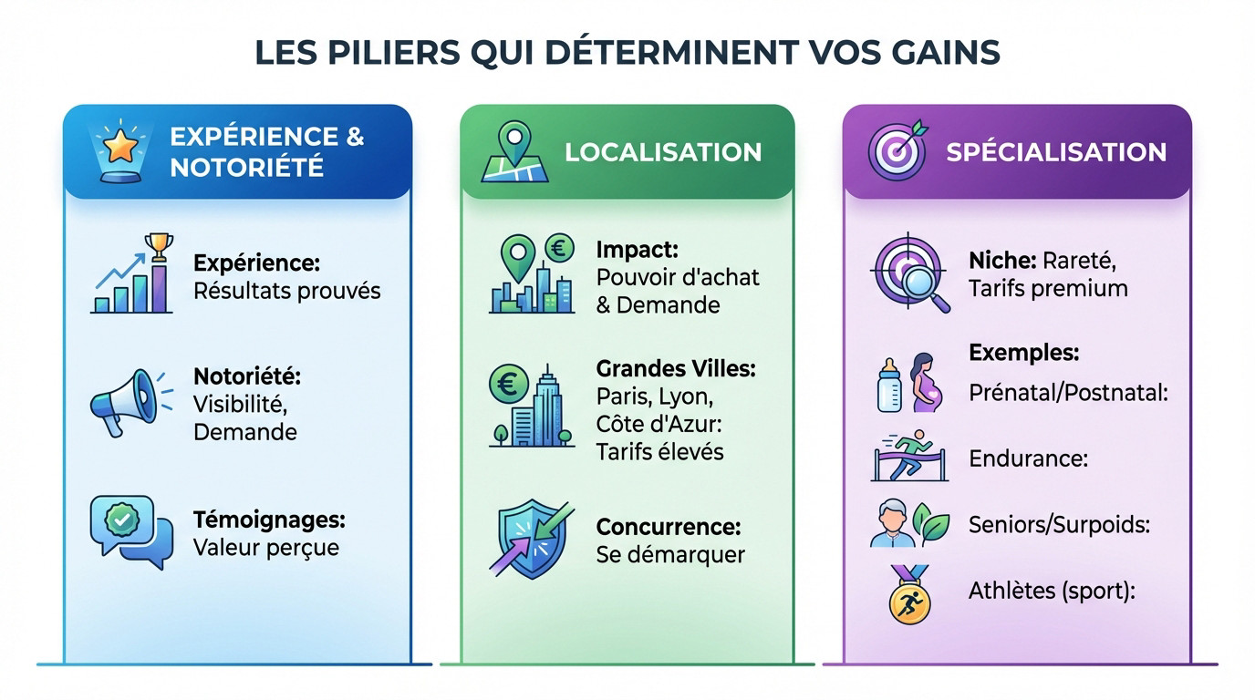 Les coachs qui gagnent le mieux leur vie sont ceux qui sortent du lot par une spécialisation forte. Les experts en préparation physique pour des sports spécifiques (triathlon, marathon) ou ceux qui s'adressent à des publics particuliers (seniors, périnatalité, post-rééducation) peuvent justifier des tarifs premium, souvent supérieurs à 70 euros de l'heure.