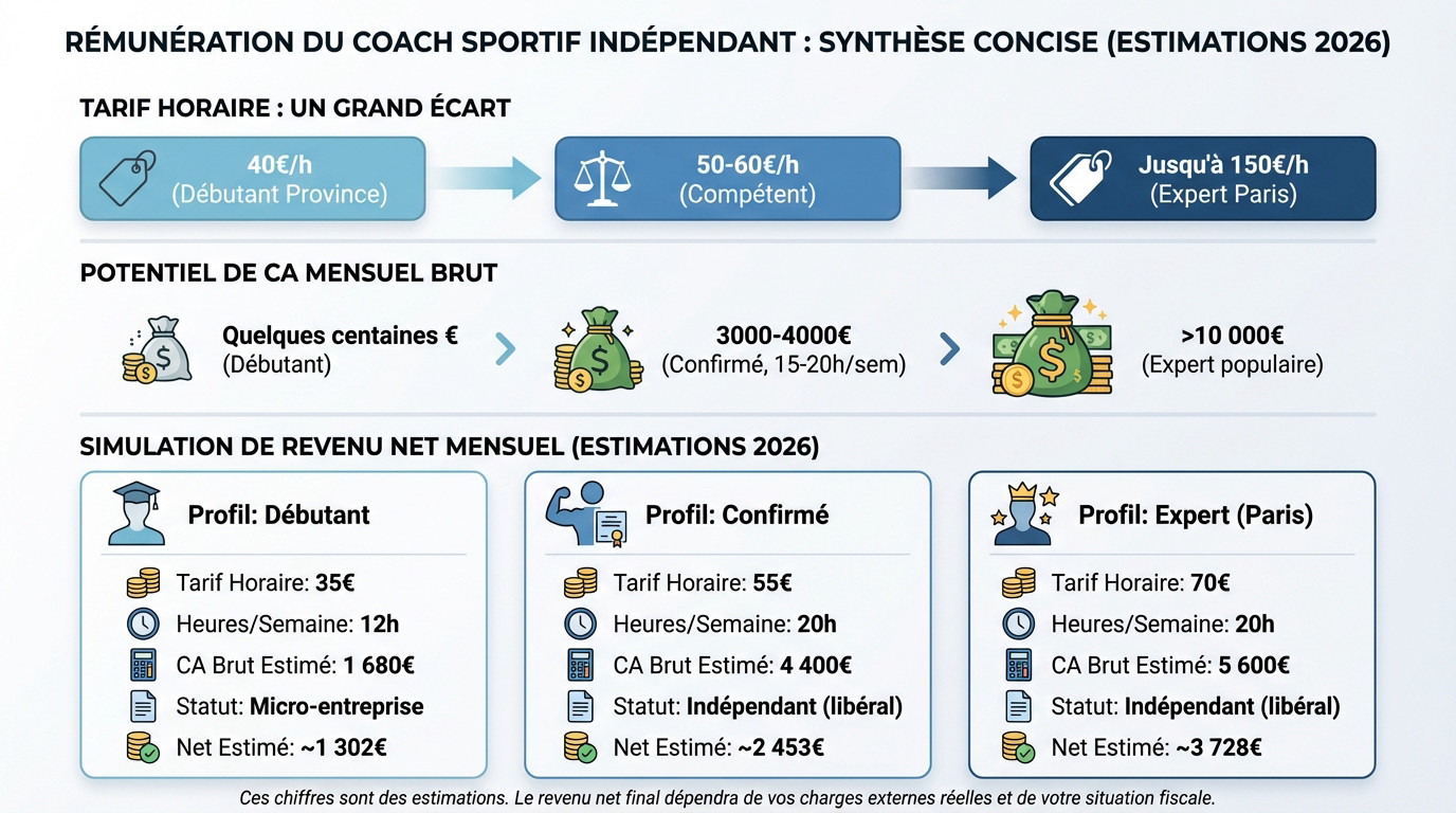 | Coach Expert (Paris) | 70€ | 20h | 5 600€ | Indépendant (libéral) | ~3 728€ |